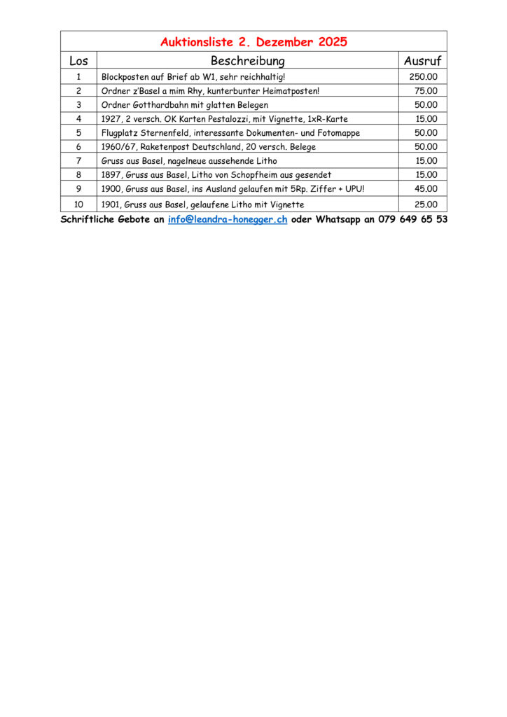 Anlässlich der nächsten Vereinsversammlung findet wie üblich eine Auktion durch Leandra Honegger (www.leandra-honegger.ch/) statt. Nachstehend die Liste der Lose mit Kurzbeschreibung