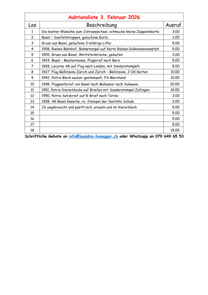 Anlässlich der nächsten Vereinsversammlung findet wie üblich eine Auktion durch Leandra Honegger (www.leandra-honegger.ch/) statt. Nachstehend die Liste der Lose mit Kurzbeschreibung.