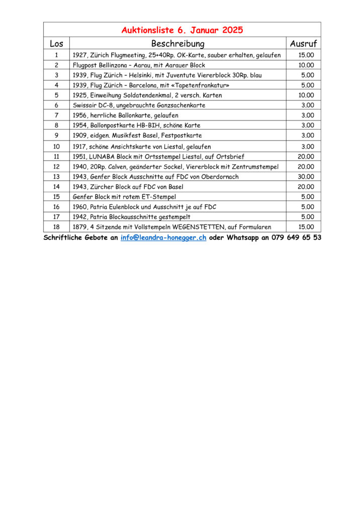 Anlässlich der nächsten Vereinsversammlung findet wie üblich eine Auktion durch Leandra Honegger (www.leandra-honegger.ch/) statt. Nachstehend die Liste der Lose mit Kurzbeschreibung